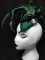Tocado forrado con terciopelo azul, plumas de pavo real, lazos a juego y dos charmas, uno de un rosetón gótico y otro de una llave.